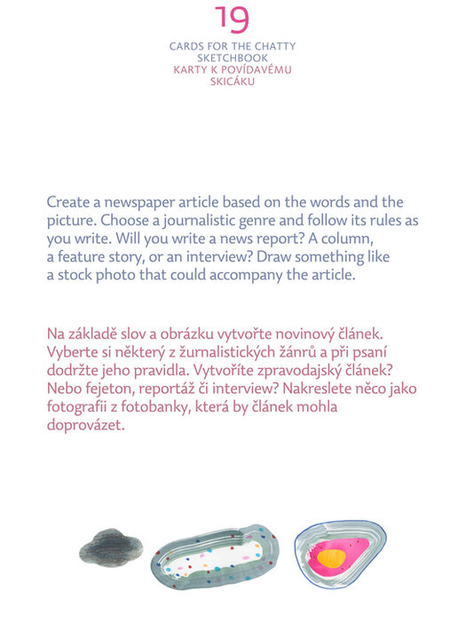 Povídavý skicák můžete samozřejmě používat úplně svobodně. Pokud ale oceníte nové podněty a rádi si hrajete, využijte doprovodné karty. Jak? Úplně jednoduše! Listujte si Povídavým skicákem, zastavte se u konkrétního obrázku a náhodně si vyberte jednu kartu se zadáním. Pak na něm začněte pracovat. A tohle můžete dělat úplně donekonečna! Máme totiž 100 stránkový skicák a k tomu 30 karet. Úplně přesně tedy máte 100 × 30 možností, jak otevřít stavidla své imaginace a kreativity! A to je hodně — zvlášť když si představíme, co všechno ještě může napadnout samotné uživatele skicáku nebo učitele a učitelky, kteří jej využijí ve výuce.